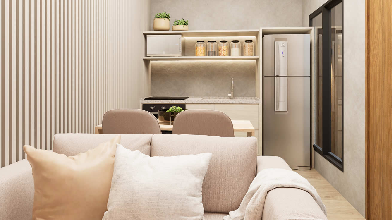 - Composição: Quarto confortável com banheiro privativo | Sala e cozinha integrados;