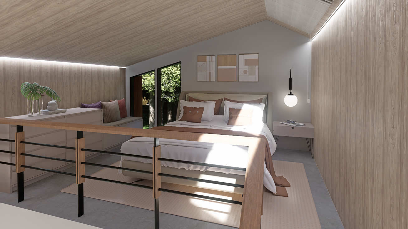 - Mezanino funcional, ideal para um quarto aconchegante com espaço para armazenamento;