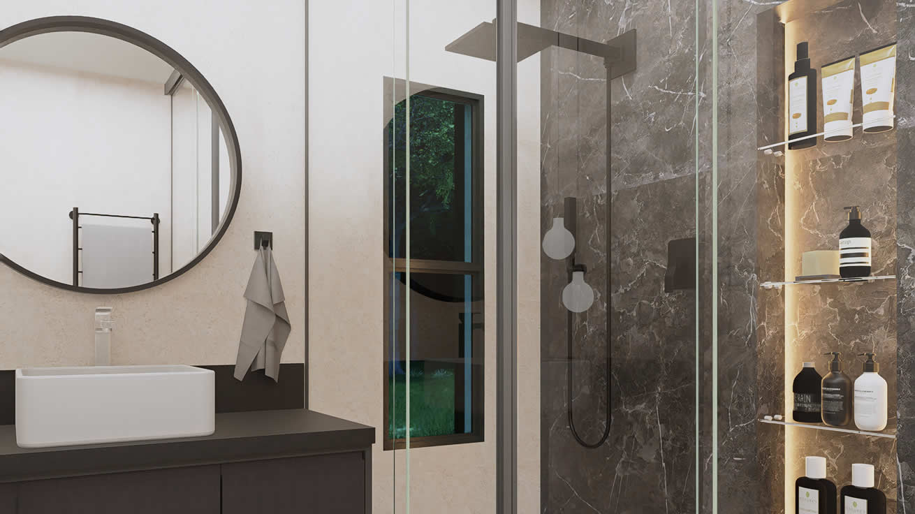 Neste pacote você pode adicionar ao pacote BASIC: bancadas em granito, louças e metais, box para banheiro e marcenaria completa, conforme o projeto (não incluso equipamentos e móveis soltos).