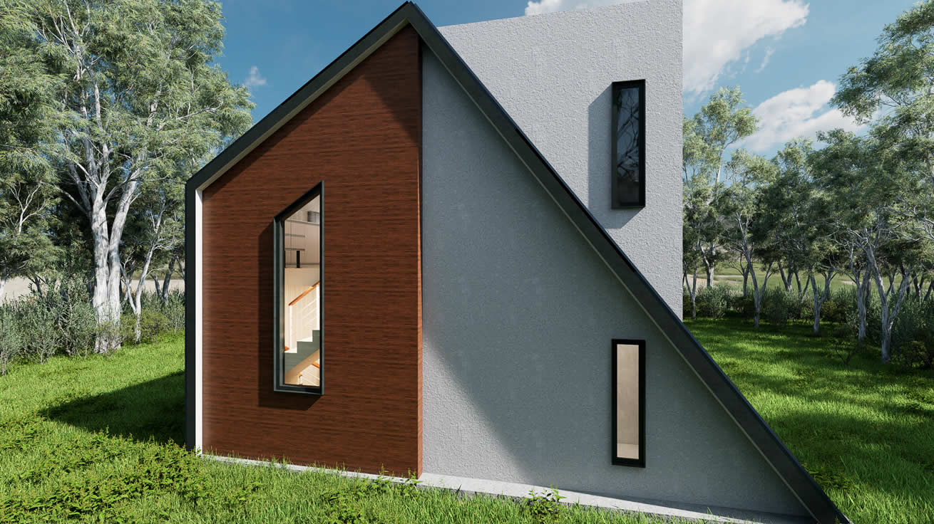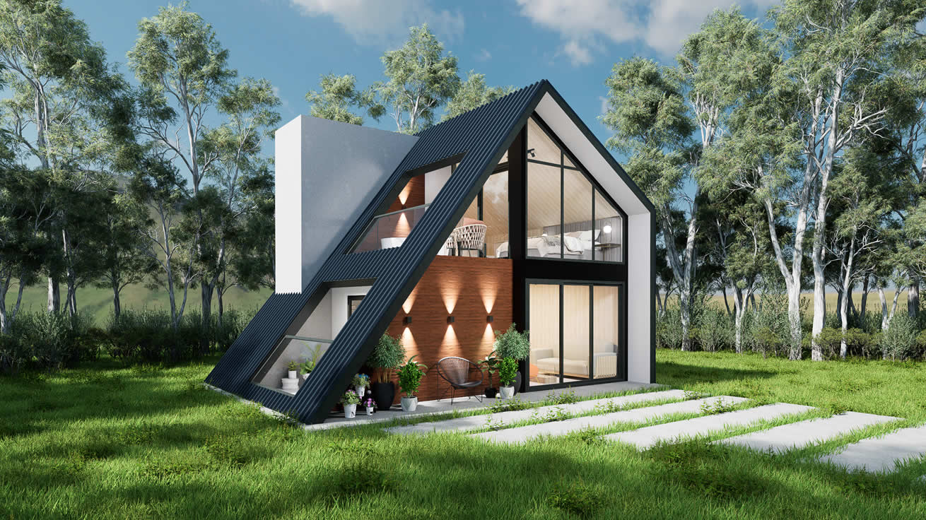 Casa Vertice – 88 m² de identidade e aproveitamento inteligente. Onde o design em ângulo encontra um layout flexível e cheio de personalidade. A Casa Vértice leva a estética das casas A-frame para um novo patamar, com volumetria marcante e interior muito mais bem aproveitado.
