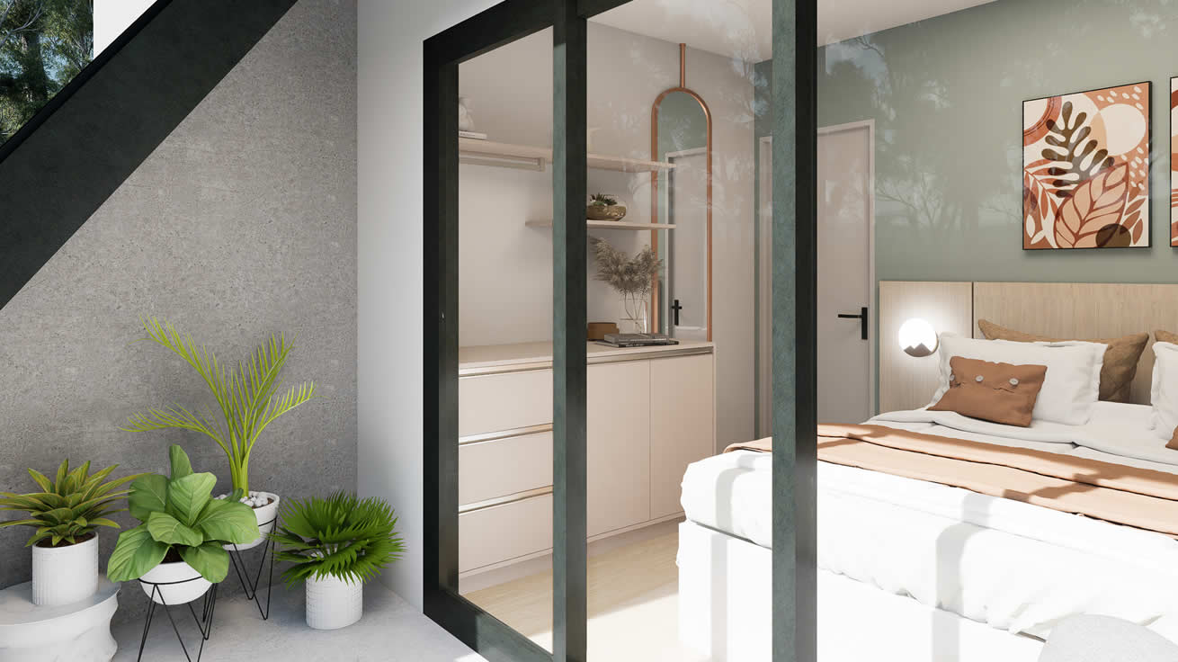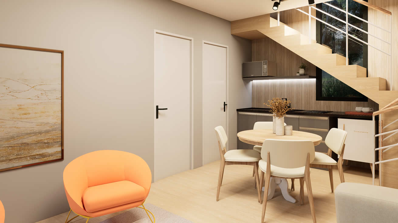 - Sala e cozinha integradas no térreo, com opção de retirar a divisão do quarto e transformar todo o andar em um grande living;