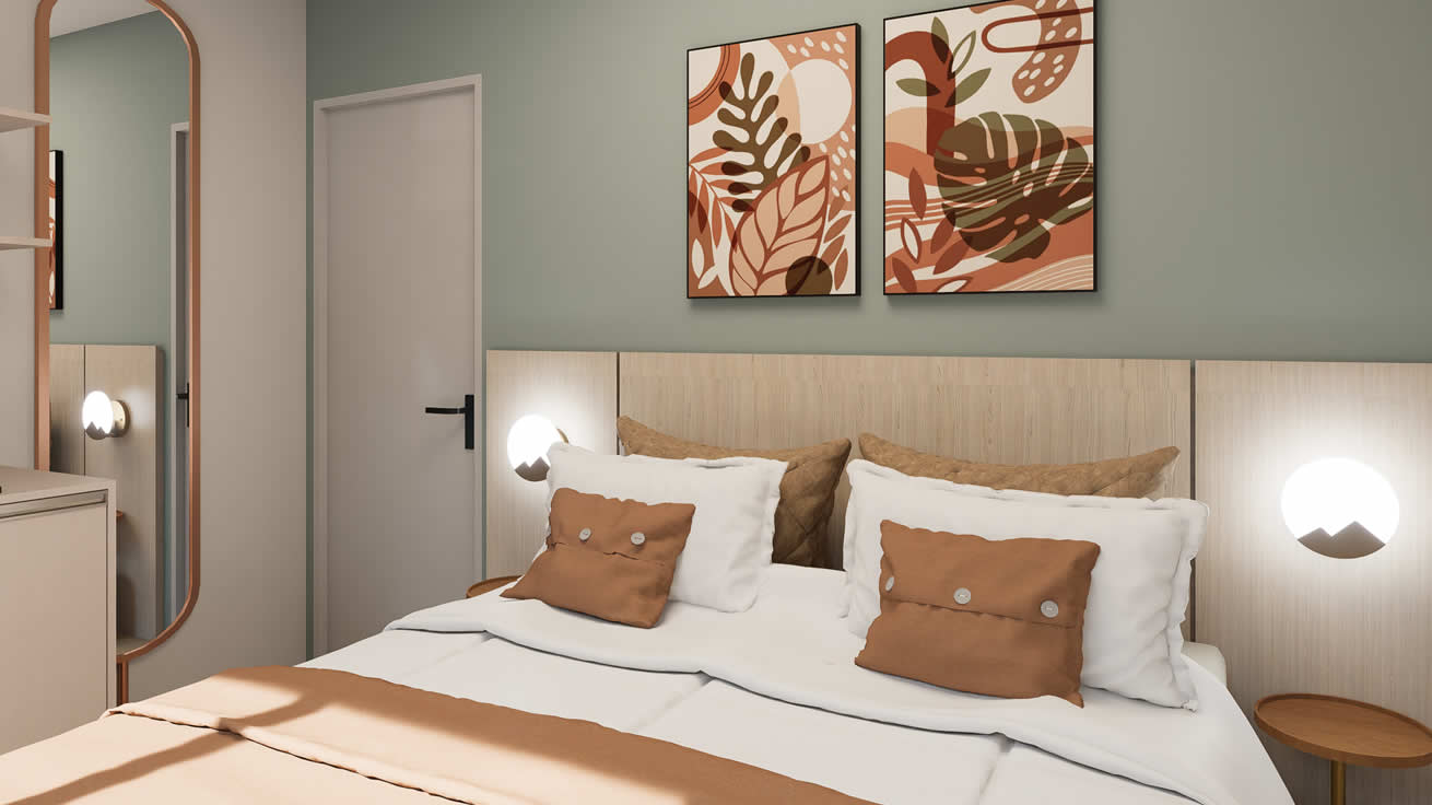 Mobiliário solto-cama, sofa, puff, cadeira, banquetas, entre outros; Marcenaria fixa; Louças, metais e bancadas; iluminação; revestimentos de piso; Equipamentos, eletrodomésticos e eletroportáteis, ar-condicionado, frigobar, cooktop, microondas, entre outros; Decorações – cortinas, persianas, vasos, plantas, almofadas, etc.