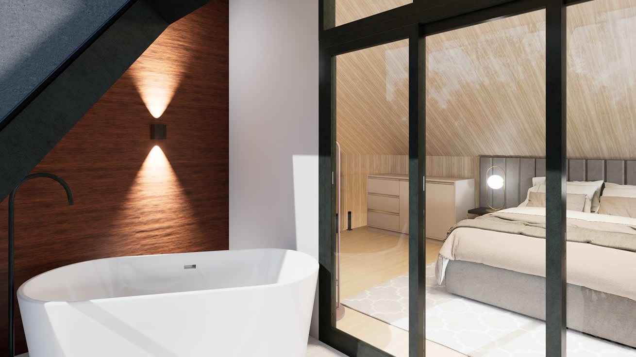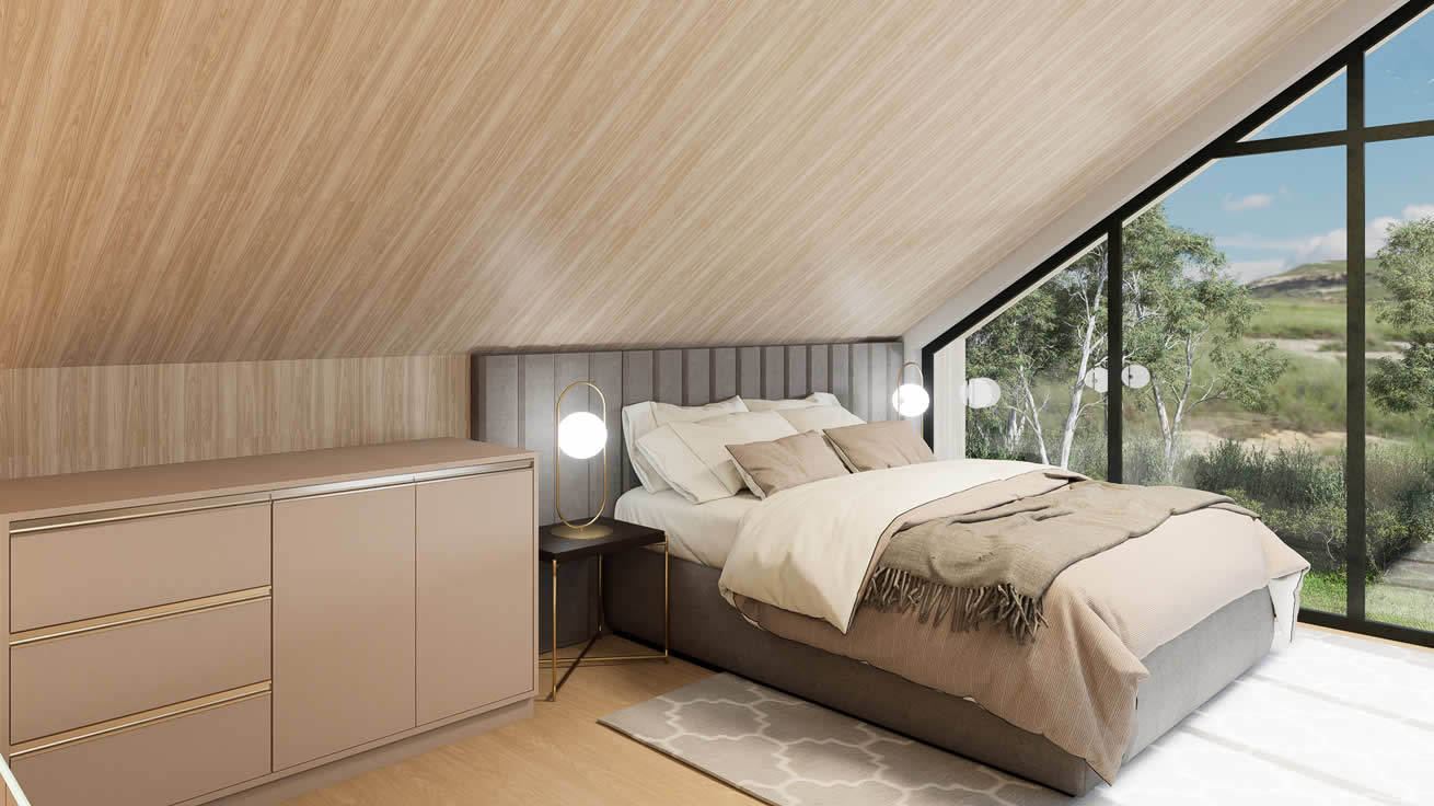 - Suíte no pavimento superior, com pé-direito variável e grandes aberturas trazendo aconchego e amplitude;