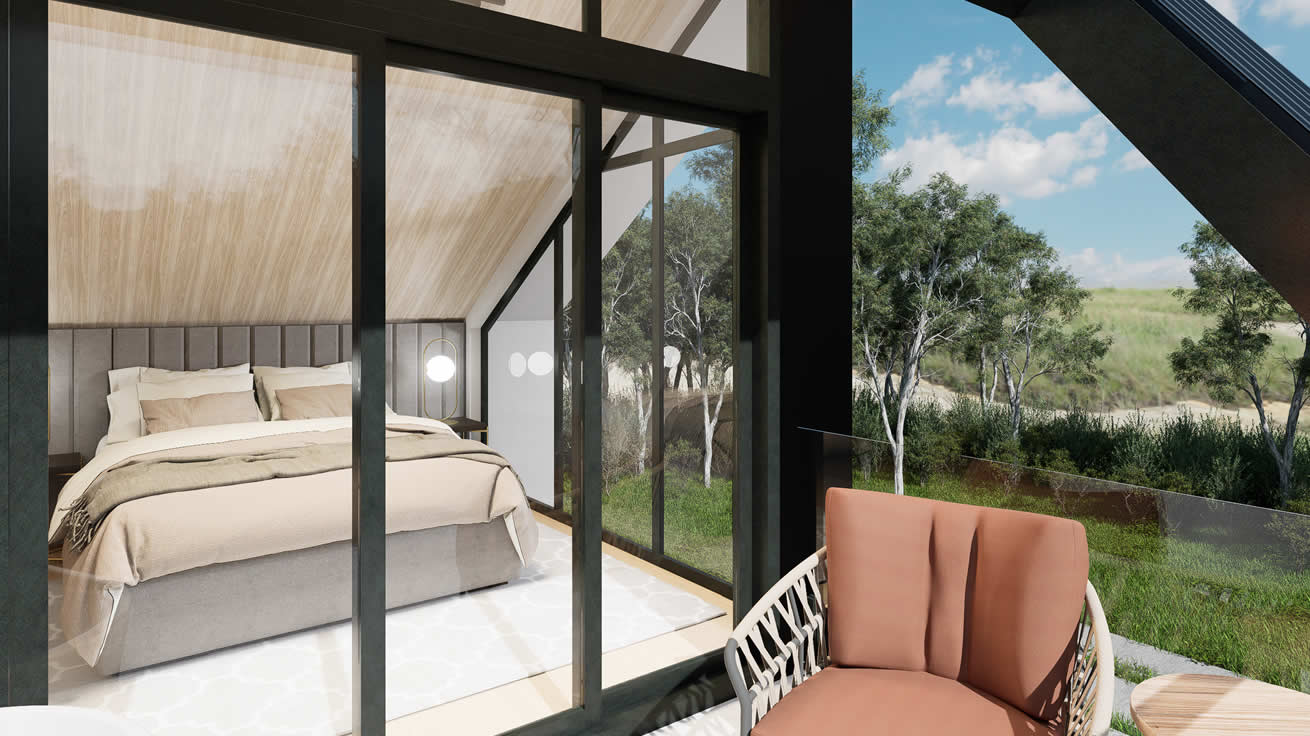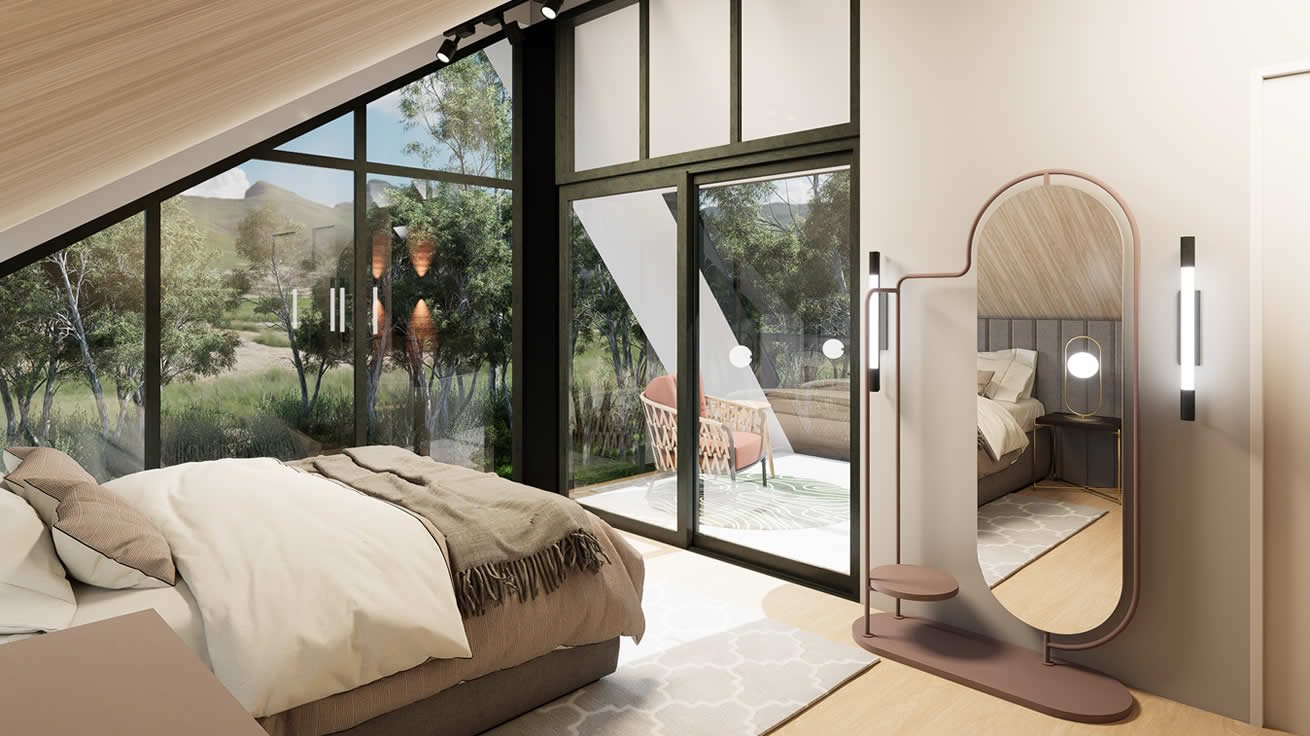 - Arquitetura inspirada na A-frame, com estrutura inclinada que confere forte identidade e cria varandas laterais protegidas;